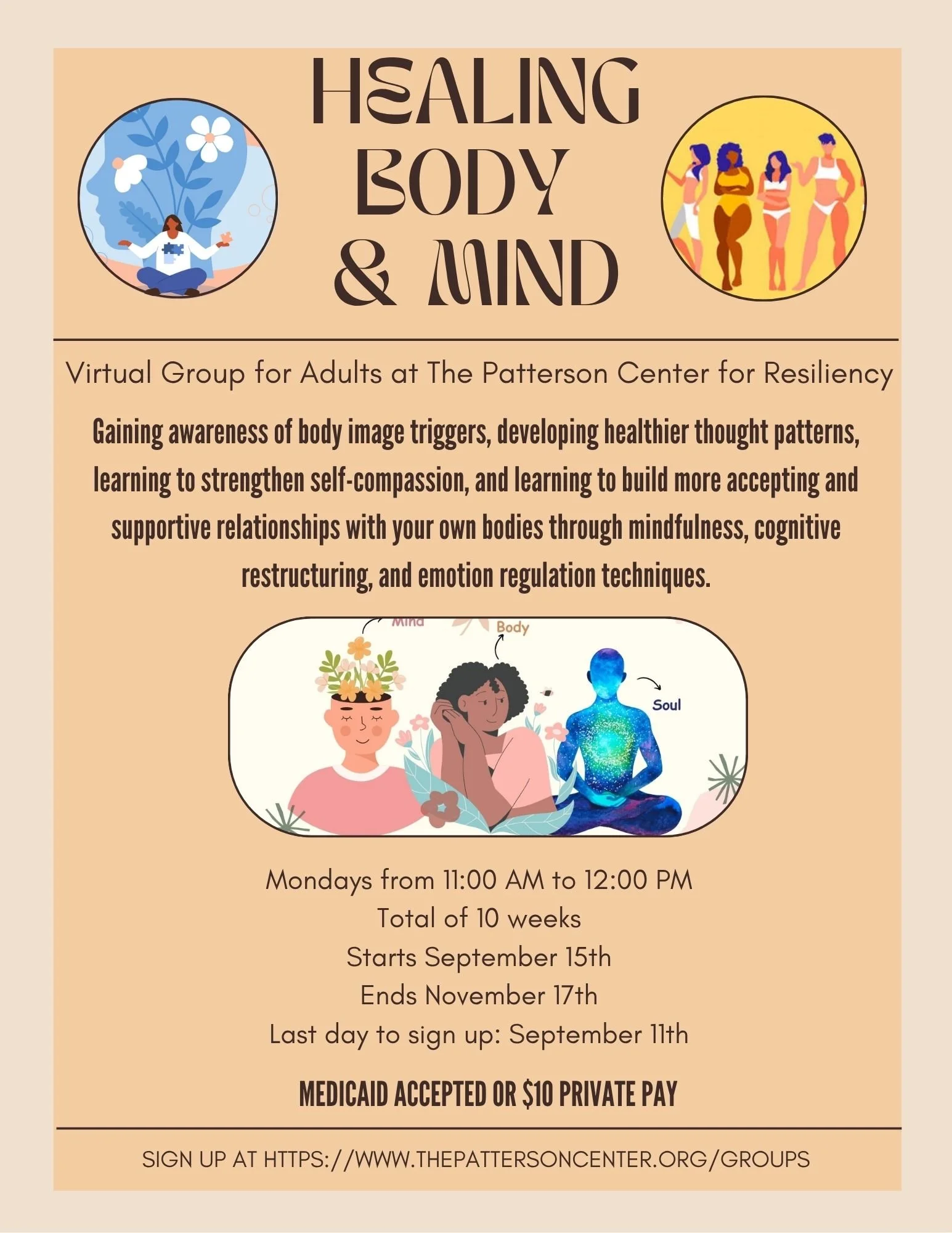 Healing Body & Mind is a virtual group for adults who want to improve their body image, develop healthier thought patterns, and learn to strengthen their self-compassion. Members will develop a more positive relationship with themselves and their bodies through mindfulness, cognitive restructuring, and emotion regulation techniques.